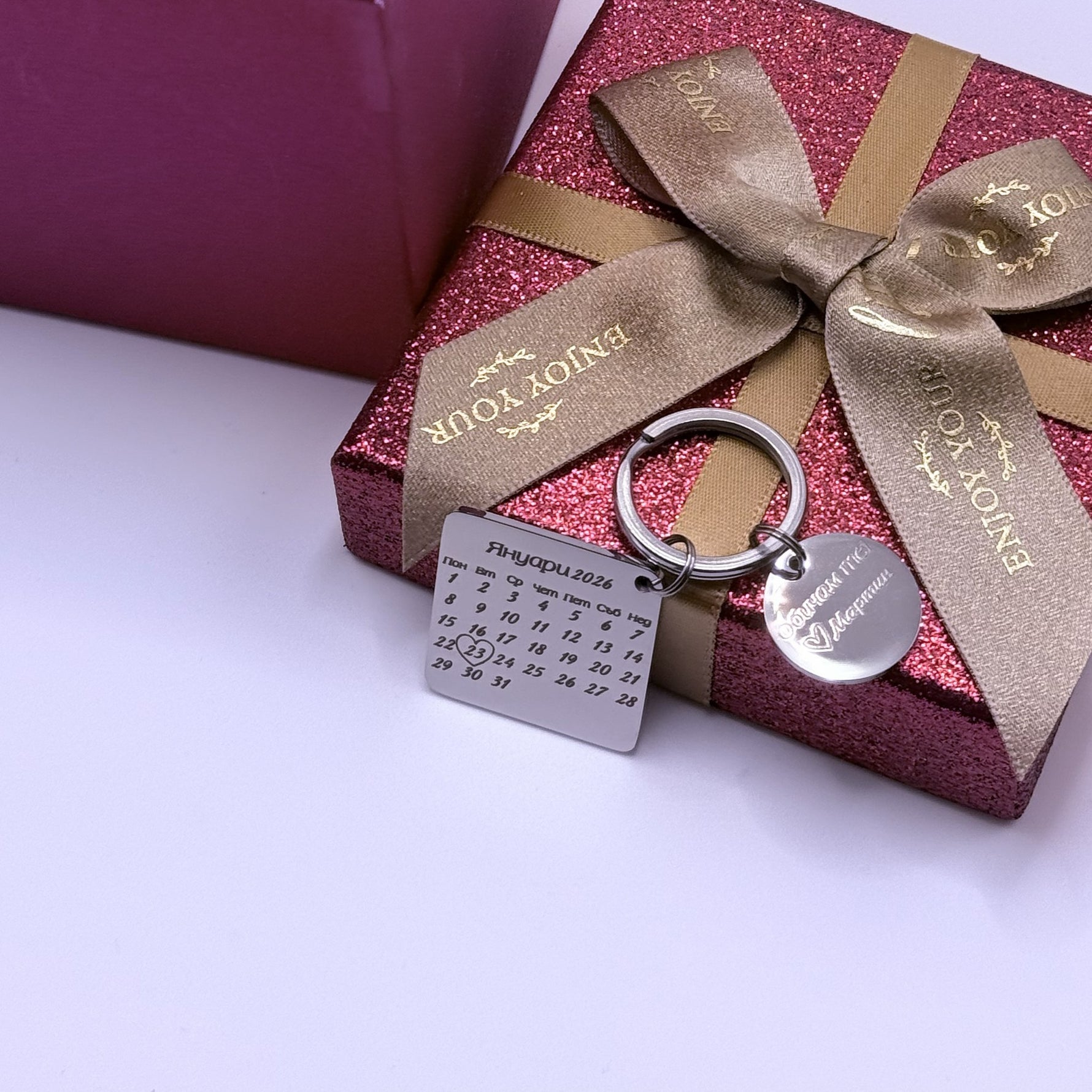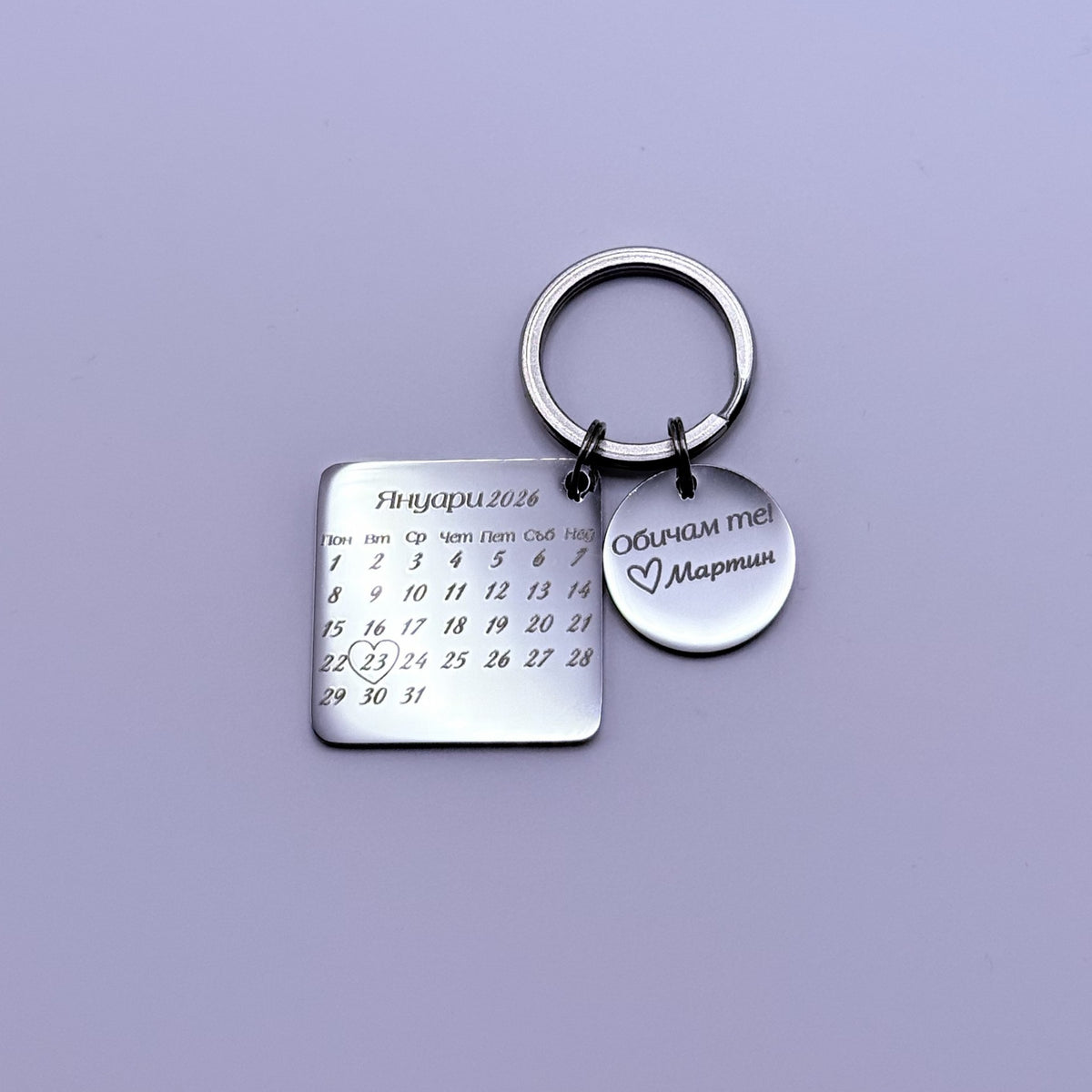 Персонализиран ключодържател с календар – стилен аксесоар и специален подарък за любим човек! Изберете значима дата, която да бъде гравирана върху календара, и добавете лично послание или инициали за още по-личен завършек. Подходящ е за рожден ден, годишнина, Свети Валентин или всеки друг повод, който заслужава да бъде запомнен завинаги.