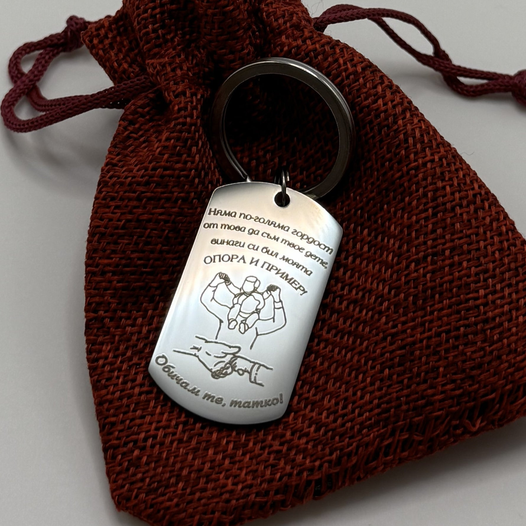 Този стилен ключодържател за баща съчетава елегантна визия и силно емоционално послание в скъп спомен, който ще се носи с гордост всеки ден. Подходящ е като подарък за Деня на бащата, рожден ден или просто за момент, в който искаш да му напомниш колко много означава за теб.